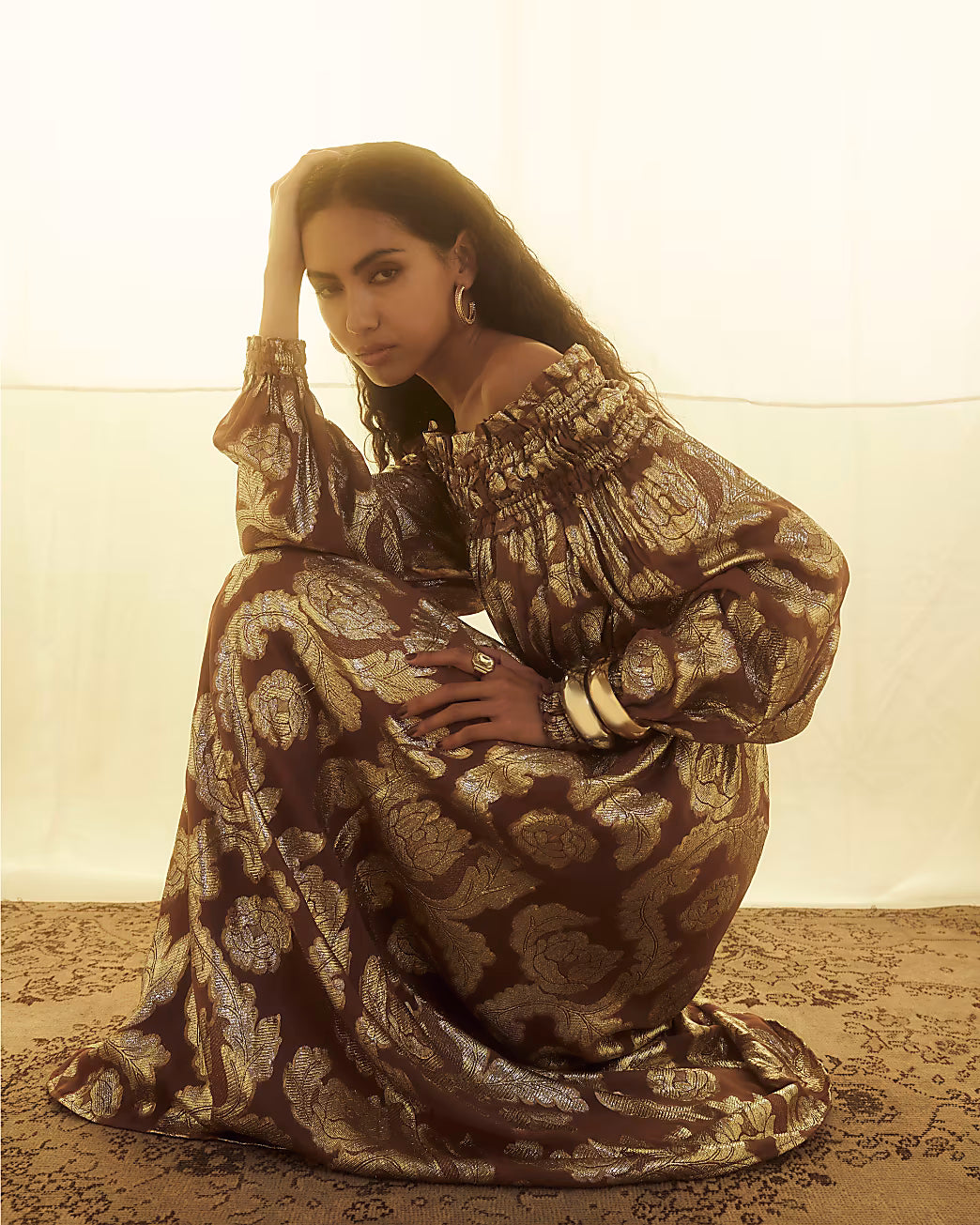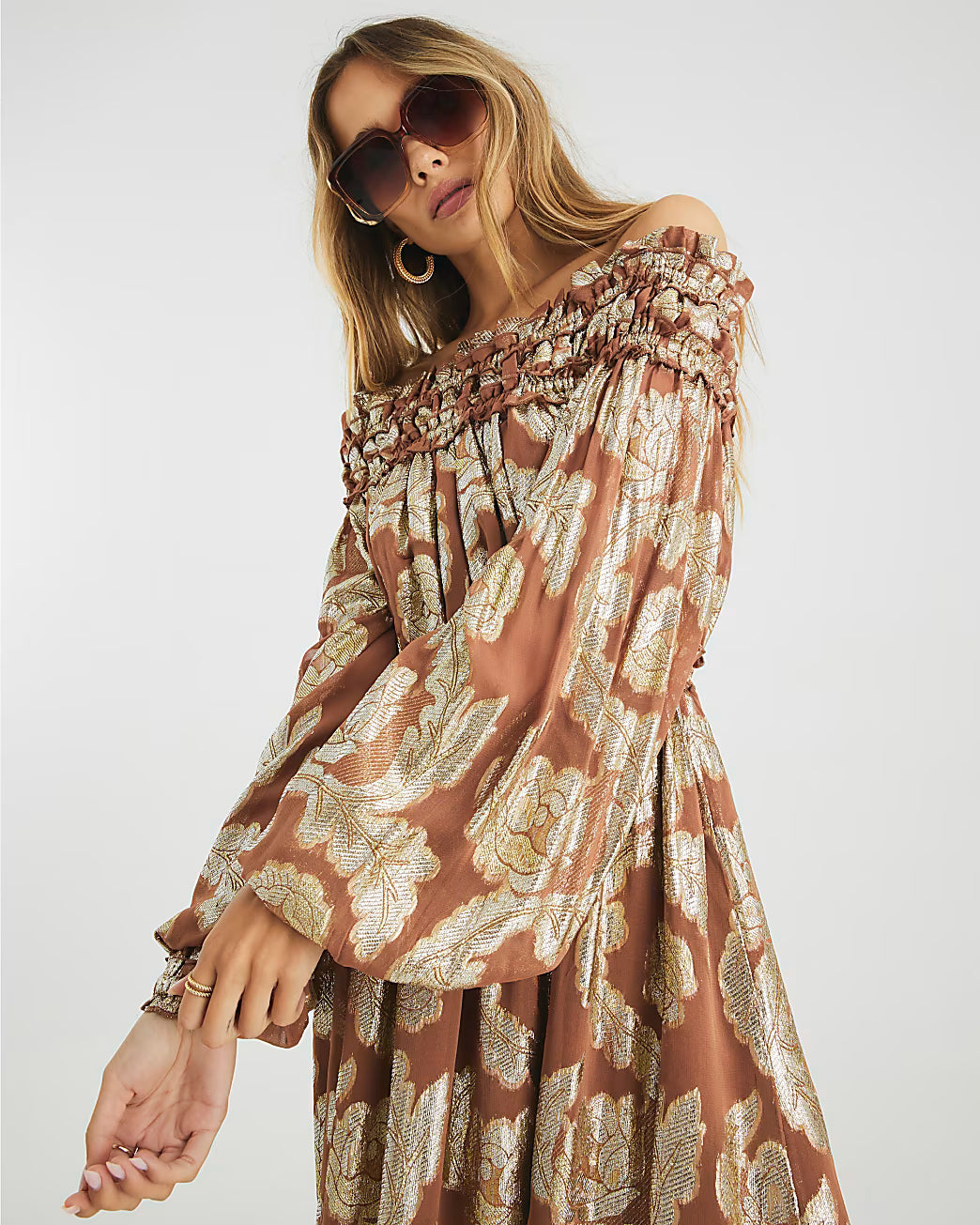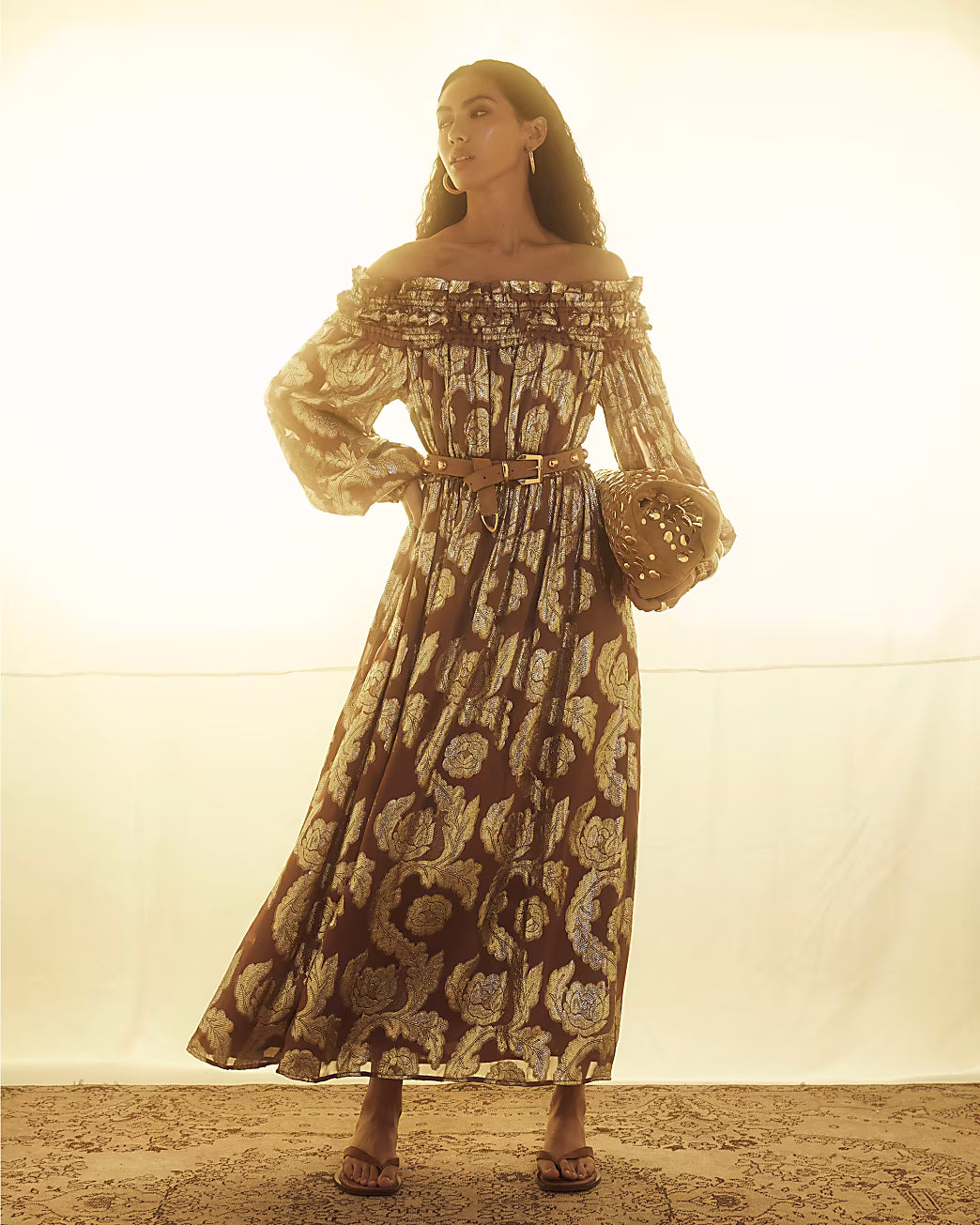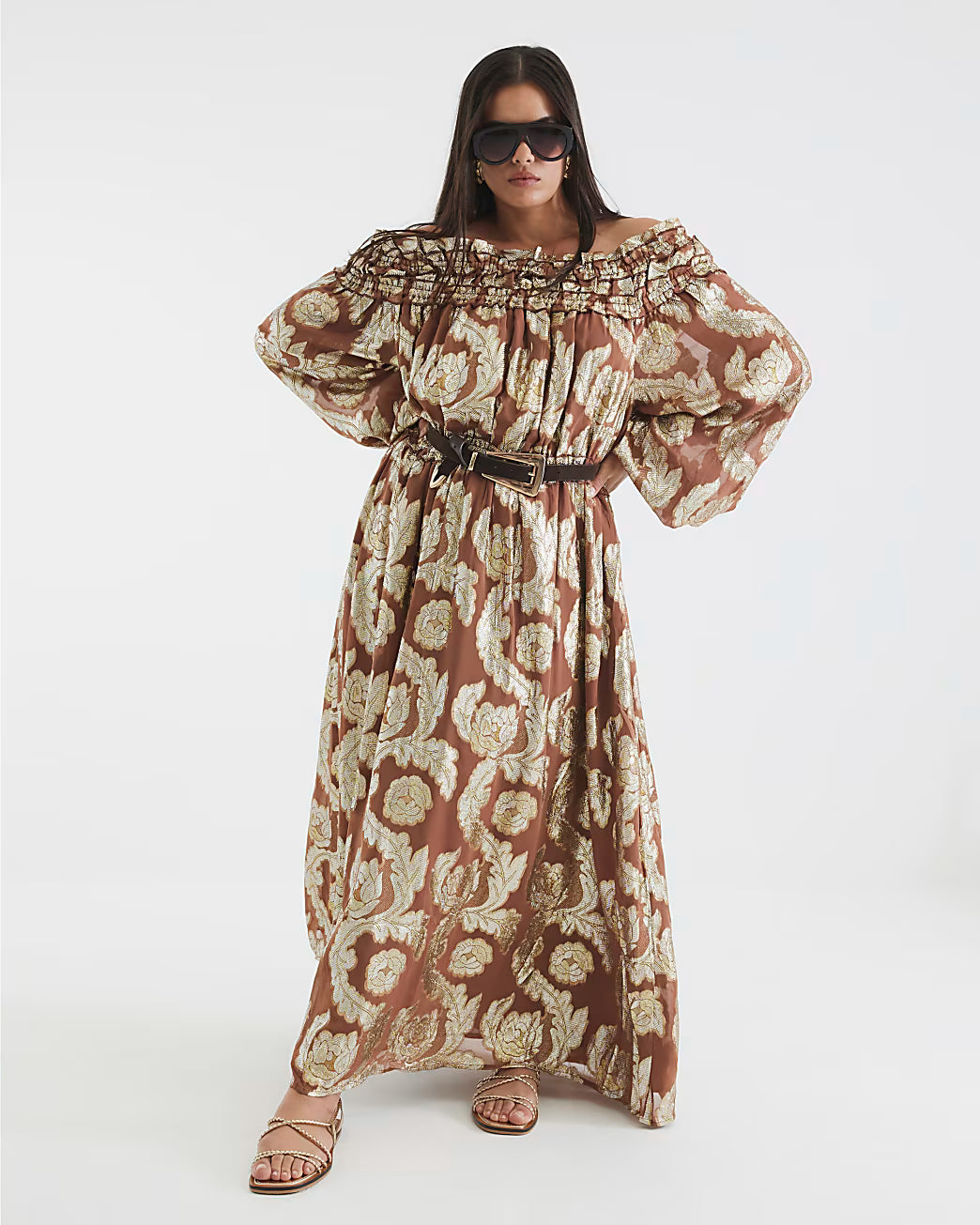 Brown Ruffled Gold Detail Bardot Maxi Dress