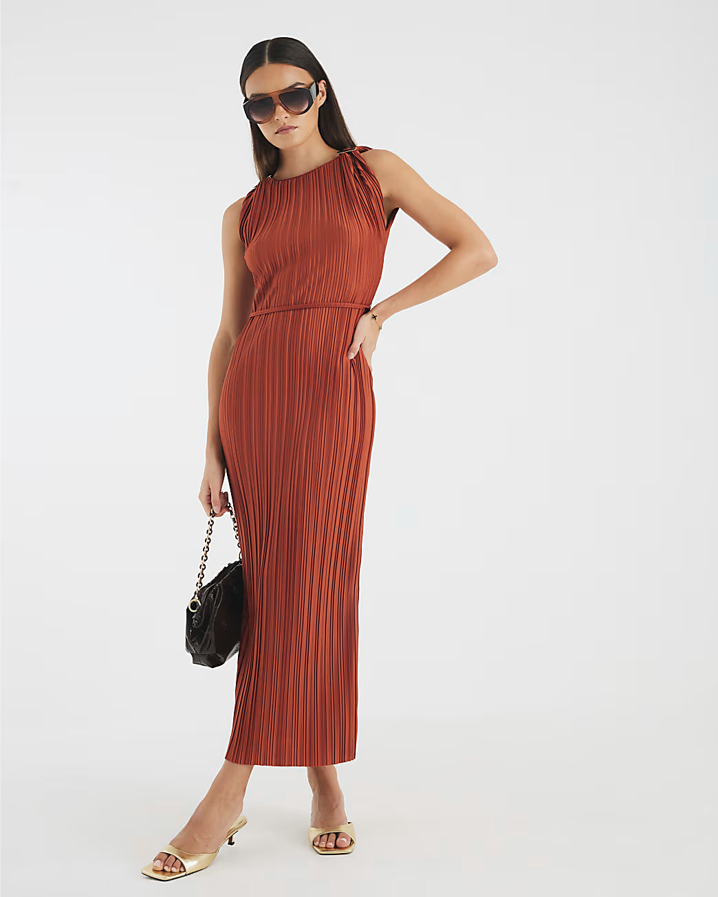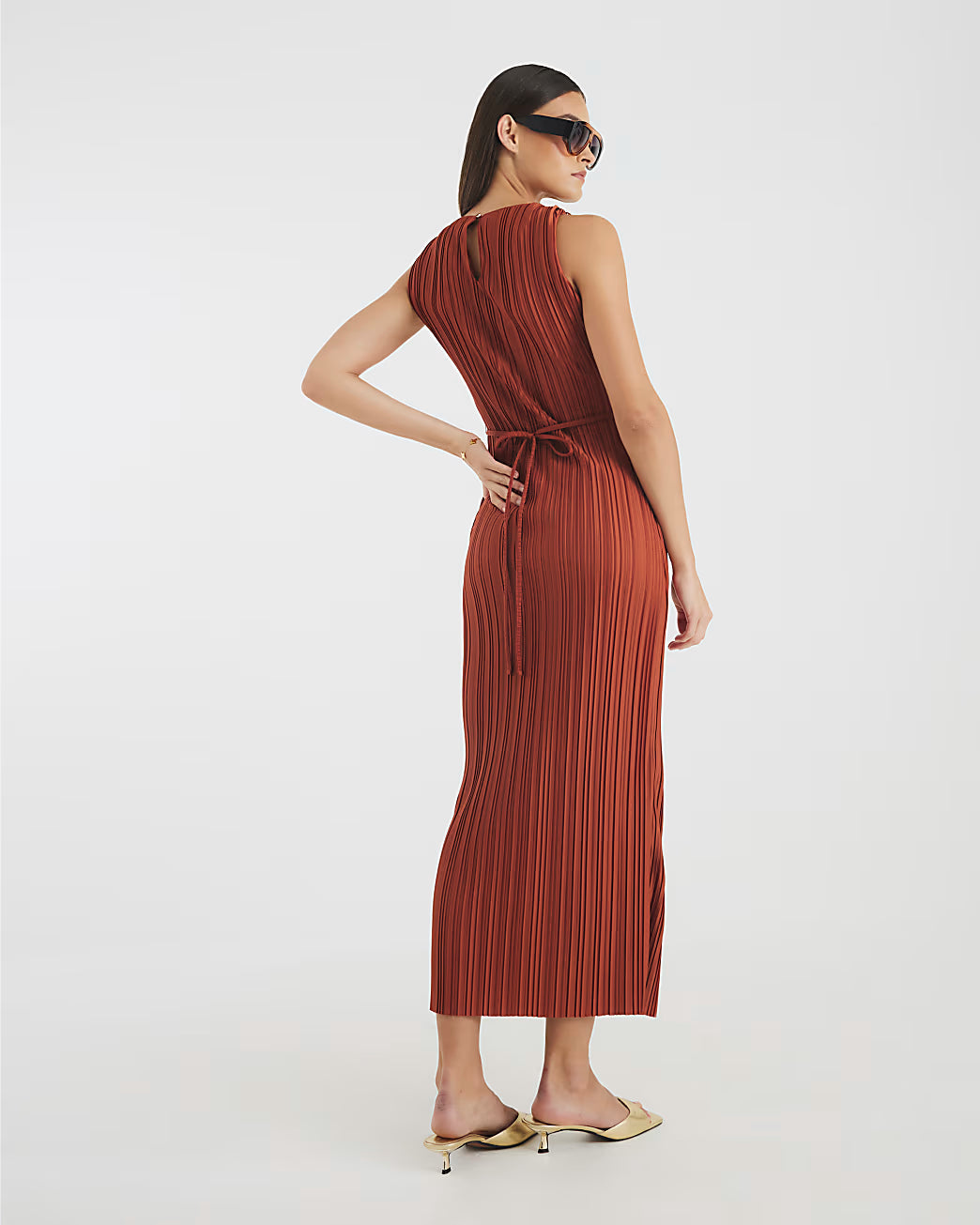 Orange Sleeveless Plisse Belted Midi Dress