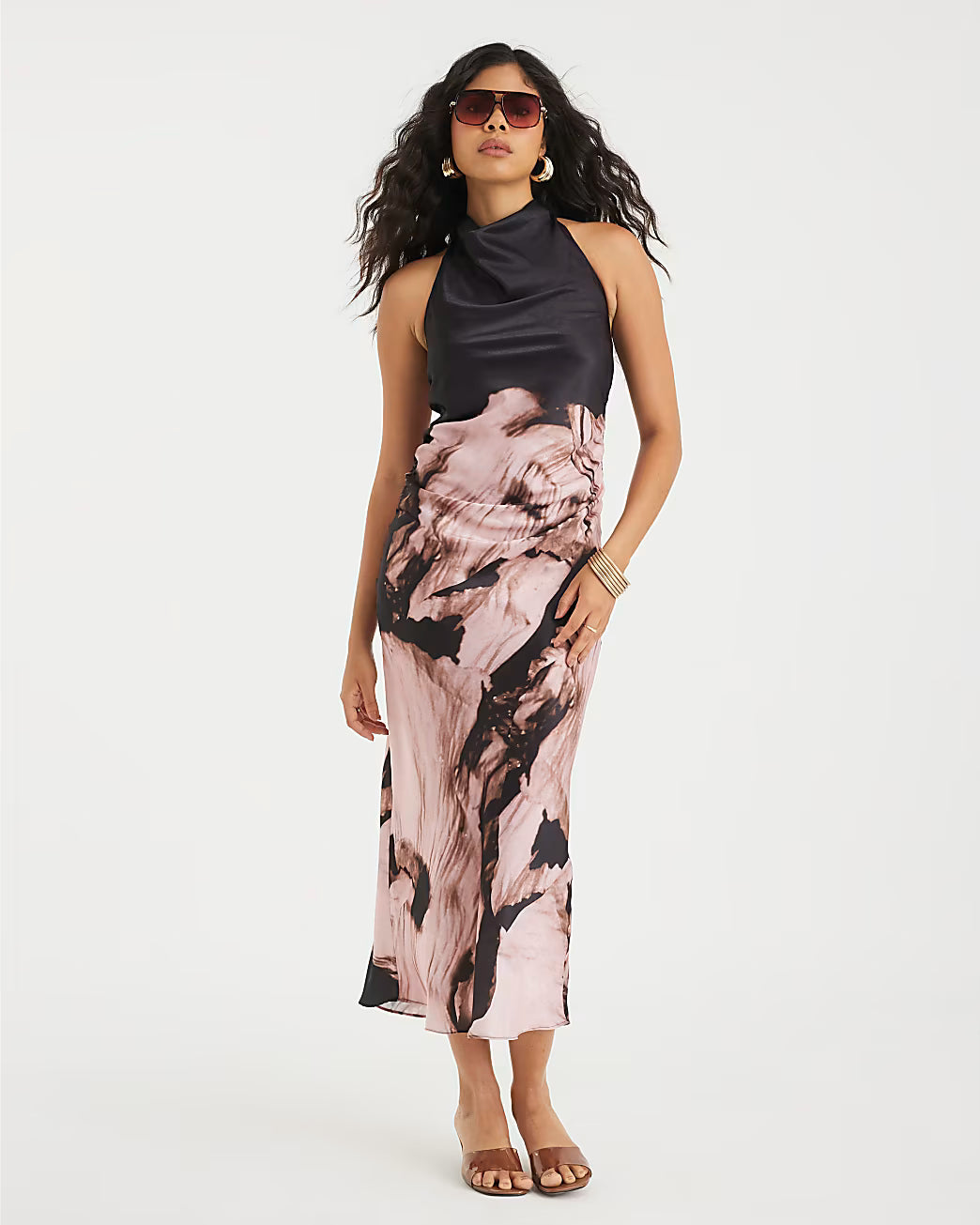 Pink Satin Printed Cowl Neck Slip Dress